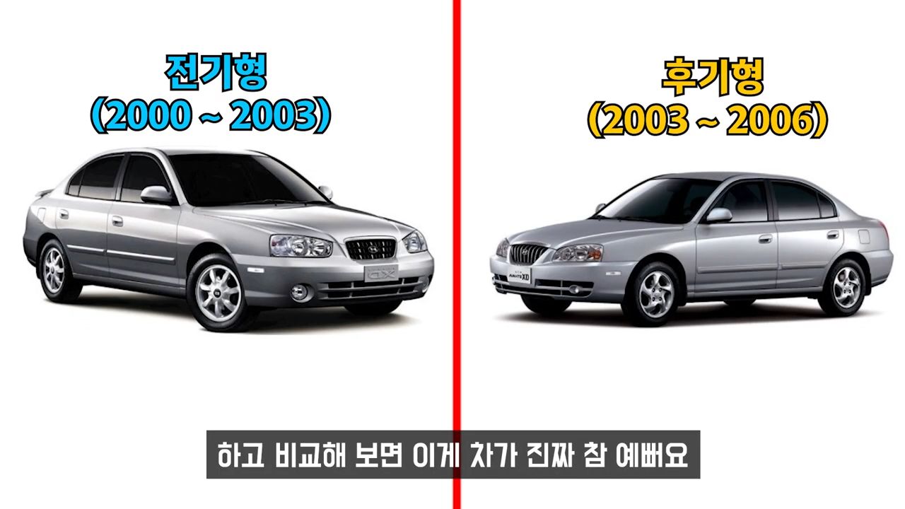 제가 정말 이 차의 디자인이 좋은 점이 전기형, 그냥 아반떼 XD 하고 비교해 보면 후기형이 진짜 참 예뻐요. 범퍼, 헤드라이트, 리어라이트가 다 다릅니다. 앞에 라디에이터 그릴이 전기형에서는 얘기가 좀 많았는데요. 그게 격자 그릴인데 헤드라이트랑 시너지를 일으켜서 사람들이 꼭 멍 때리는 것처럼 생겼어요. 근데 딱 뉴 아반떼 XD가 되면서 그릴도 세로고 헤드라이트도 똘망똘망해지고 범퍼도 바뀌어서 제가 되게 좋아했었어요.