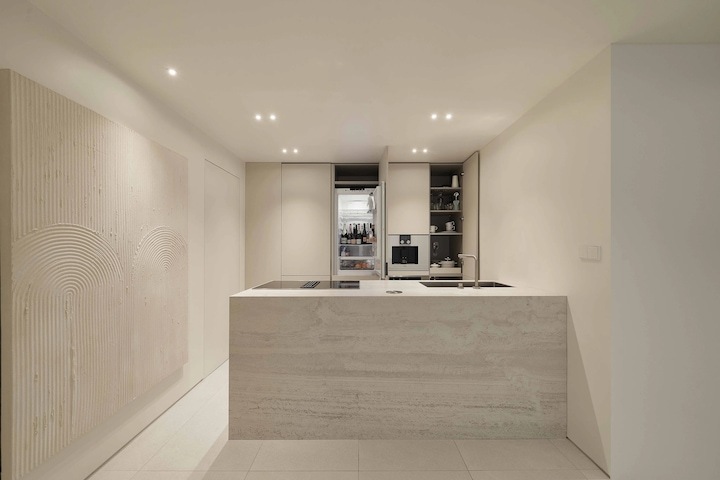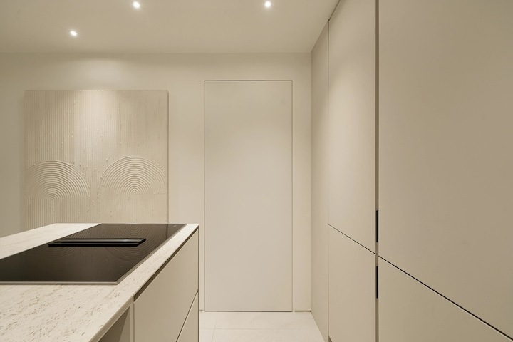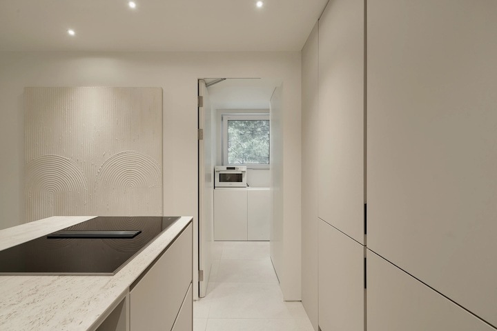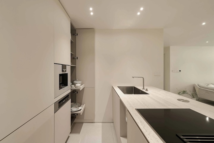 전반적인 구성을 대면형 구조로 바꾸었어요. 공간의 효율성을 위해서 밀레 빌트인 세탁기와 인덕션 후드를 사용하고 냉장고는 LG 도어 부착형 빌트인 냉장고를 사용해서 최대한 통일성 있고 담백한 레이아웃을 완성했어요. (냉장고 용량이 작아 걱정했는데.. 생각보다 너무 괜찮습니다!!)
