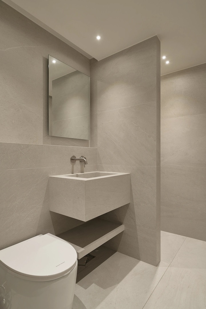 무조건 청소 중심으로 꾸며 보았습니다. 변기도 모양이 복잡하면 청소하기 어려우니 탱크 없는 아메리칸 스탠다드 스탠리 제품을 사용했어요. (리모컨으로 물 내림을 사용할 수 있어서 너무 편리합니다.) 세면대도 특유의 유광 도기 느낌이 너무 싫어서 요즘 많이 사용하는 포세린 타일로 제작한 세면대를 사용했어요. 청소도 용이하고 상판에 뭘 올려두기가 편합니다. 욕실은 역시 청소가 쉽고 편한게... 최고!