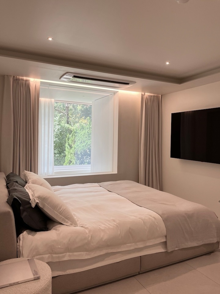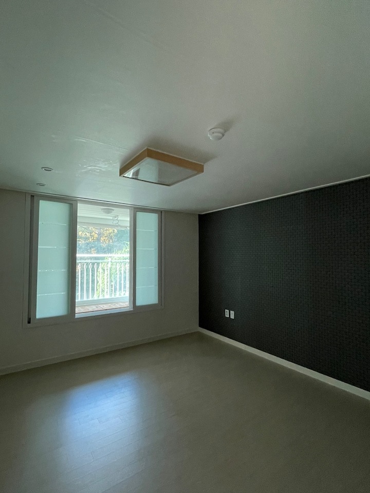 거실에는 보이지 않던 나무 뷰가 안방에서 살짝 보이길래 이 부분만큼은 꼭 살리고 싶었어요. 어른들 모두 반대했지만... 기존 두꺼운 창문 프레임을 뜯고 프레임 없는 유리로 진행했어요.