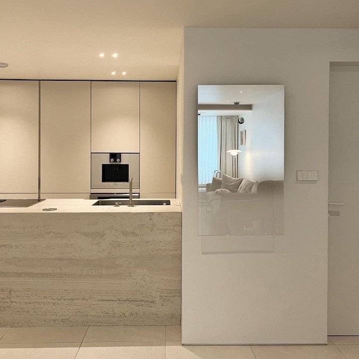 거실에서 보이는 주방 모습이에요:) 주방 벽면에 적당한 포인트를 주는 거울도 함께 걸어주었어요.