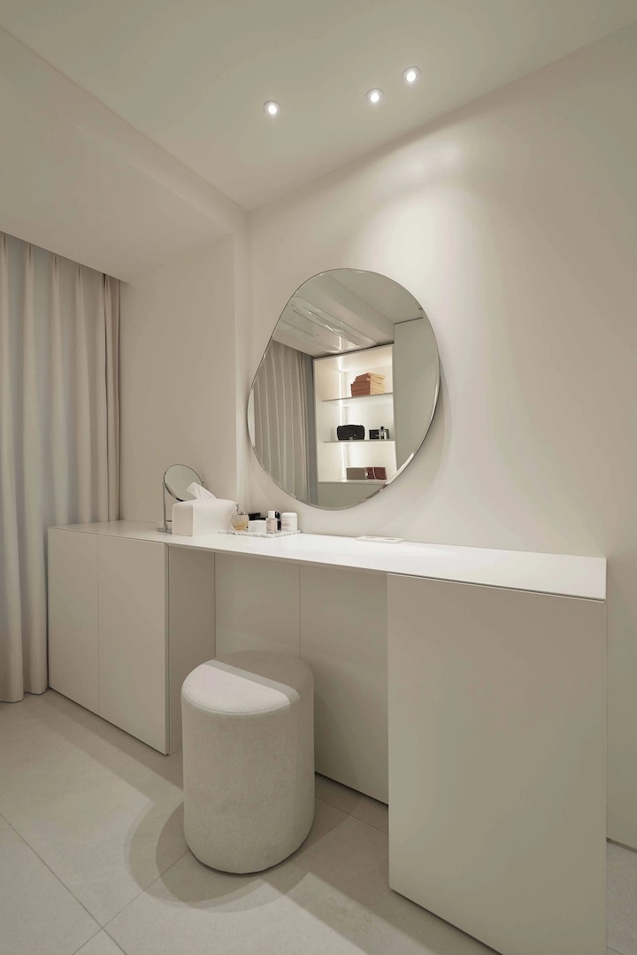 화장대의 포인트로 비정형 거울을 설치했어요. 화장대 역시 붙박이장과 통일성 있게 같은 디자인으로 구성해본 모습이에요.