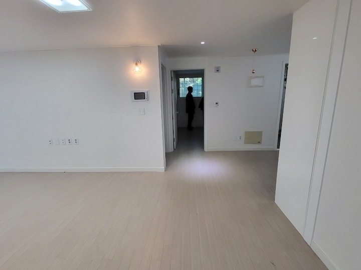 이 집은 들어오자마자 전면부로 인터폰, 스피커, 온도 조절기, 스위치, 콘센트, 비상등 모든 것들이 다 보이고 있었어요. 무조건 없앨 수는 없기에 인터폰과 온도 조절기 스위치는 비교적 안 보이는 반대편 벽으로 이동시켜 주었고 스피커와 비상등은 천정으로 이동, 콘센트 스위치는 보여도 예쁜 유럽형 융 스위치로 바꿔줬습니다.