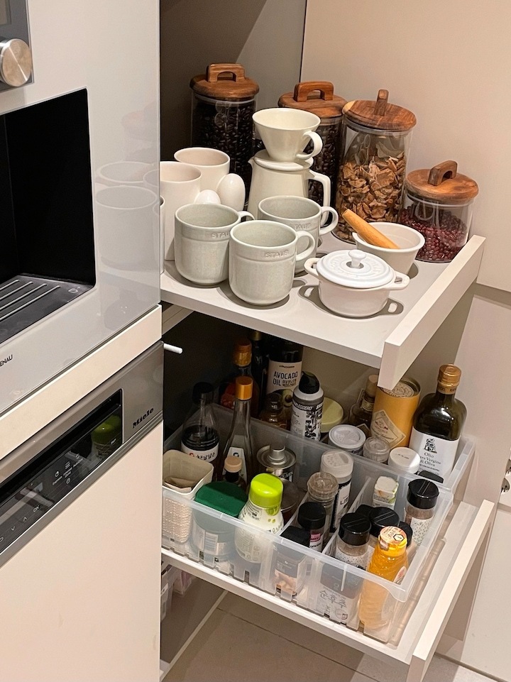 정말 작은 주방이라 수납을 최대한 알차게 사용하기 위해 키 큰 장에 인출 선반을 사용했어요. 처음엔 그릇들을 수납하다가 지금은 양념장들이 너무 많아져서.. 양념을 수납하는데 찰떡입니다:) 다른 선반들도 더 인출 선반으로으로 계획했어도 더 좋겠다 싶어요!
