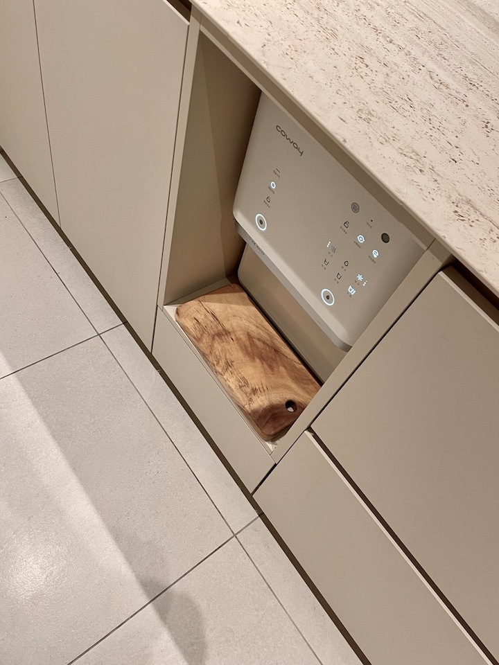 어른들이 처음에 보시고.. 깜짝 놀라셨지만.. 정말 대대만족입니다. 얼음 정수기를 절대 포기 못하는 저희 부부는 '불편해도 괜찮다' 라는 마음으로 하부로 빌트인 했는데요. 저 나무 도마 부분에 간단한 냄비 올려서 물 받기도 편하고 물먹는데도 크게 불편함은 없어요! 물론 주방이 큰집으로 이사 가면 ... 상판에 해야죠 ..? ㅎㅎ