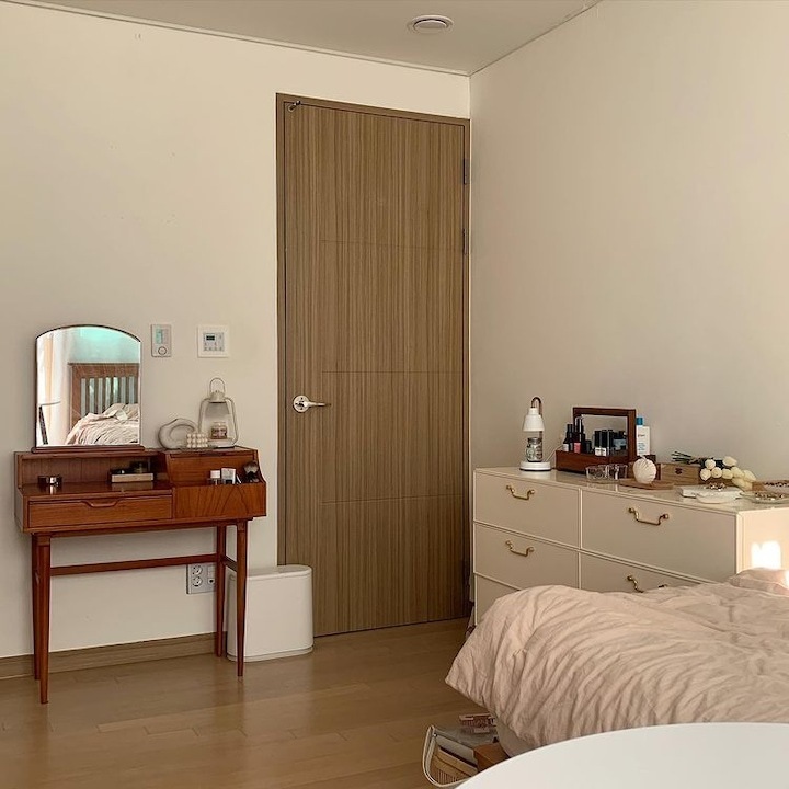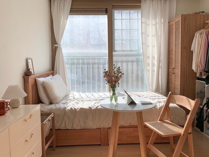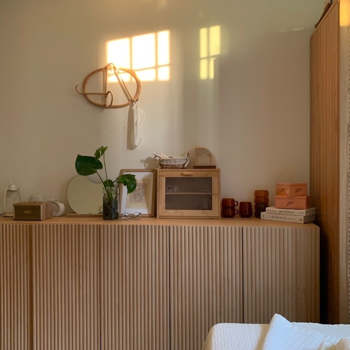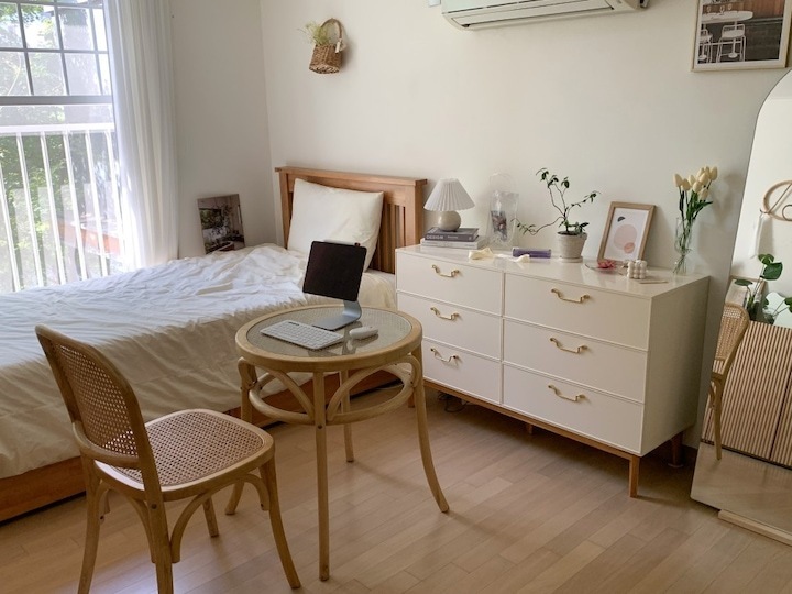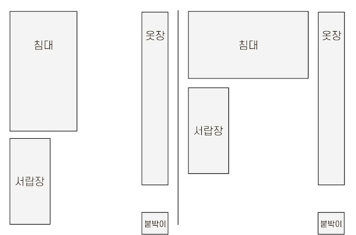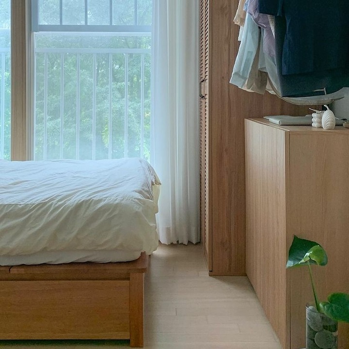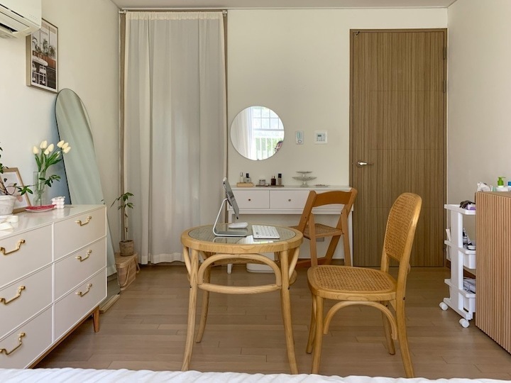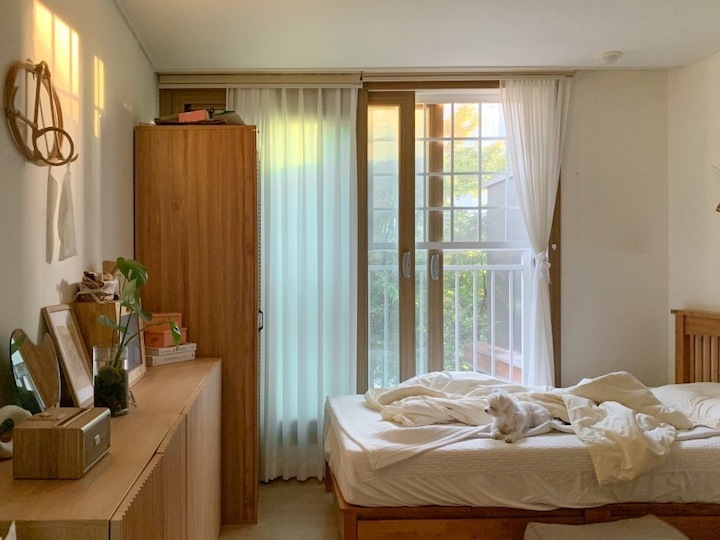저는 일 년에 한 번에서 두 번 정도 가구 배치를 하면서 인테리어에 변화를 주는 편이에요. 같은 방, 같은 가구지만 어떻게 배치하냐에 따라 새로운 분위기 연출이 가능하잖아요. 분위기도 분위기지만 가구 배치에 따라서 공간 활용도 정말 다양하게 활용할 수 있어요. 이렇게 몇 년 동안 꾸준히 가구를 재배치하다 보니 이제는 옷장, 침대 하나쯤은 정말 거뜬히 위치를 옮길 수 있지 뭐예요🤣 이번에는 3차에 걸친 가구 이동이 있었는데 그 변화 과정을 써보려고 해요. > 1차 가구 배치 작년 겨울 감자룸의 모습이랍니다. 침대 헤드가 창가 쪽으로 향해 있었고 문을 사이에 두고 양옆으로 화장대와 서랍장 침대 반대편은 긴 옷장과 옷걸이, 선반 등이 위치했었어요. > 2차 가구 배치 전 구조와 비교하기 쉽도록 간단하게 배치도를 그려봤답니다. 옷장과 벽 행거는 그대로 놔두고 침대 방향을 바꿔줬어요. 침대가 세로로 배치돼 있을 때는 서랍장과 문 사이의 간격이 좁았어요. 올해는 침대를 가로로 위치를 변경하니까 서랍장을 훨씬 여유롭게 배치할 수 있었어요. 대신 옷장과 침대 간격이 좁아졌죠ㅠㅠ 그래도 옷장을 열고 닫는 데는 전혀 문제가 없는 거리였기 때문에 크게 신경 쓰이는 부분은 아니었어요. 침대의 방향만 바꿔줬을 뿐인데 방이 더 넓어 보이고, 좀 더 안정감이 느껴지지 않나요? > 3차 가구 배치 그리고 얼마 전, 가을맞이 가구배치를 다시 시도했어요. 신박한 가구배치를 원했지만 아무래도 큰 옷장과 벽 행거 때문에 한계가 있었어요. 고민 끝에 벽 행거에 걸려있던 옷들은 서랍장과 수납장, 붙박이장에 차곡차곡 잘 정리해서 수납해버리고 벽 행거를 과감하게 떼버렸어요. 그리고 서로 반대로 가구를 이동했죠. 바로 위 사진이랑 비교하니 차이점이 좀 보이시나요? 제 방의 창문이 한쪽 벽으로 쏠려있는 구도라 옷장과 침대를 서로 반대로 바꿔주기만 해도 이렇게 분위기가 확 달라지더라고요. 그리고 구조를 바꾸고 보니 매일 같은 자리에 비추던 햇살도 조금 다른 분위기로 비치더라구요?ㅎㅎ 전 구조에서는 찍을 수 없었던 새로운 구도로 사진을 찍어봤어요. 이 구도로 찍어보니 제 방의 전체적인 모습이 훨씬 더 자세하게 찍히는 것 같아요😁 위치를 서로 반대로만 바꿨는데도 이렇게 분위기가 크게 달라졌어요. 사실 전 구도가 너무 맘에 들어서 가구 이동을 망설였었는데 막상 바꾸고 나니까 금방 적응해버렸어요ㅋㅋ 아무래도 저는 제 방만 홈스타일링을 하다 보니 다양한 콘텐츠를 만들기가 좀 쉽지 않아요ㅠㅠ 그래서 이렇게 자주 구도에 변화를 주고, 소품을 이용하면서 제가 할 수 있는 선에서 열심히 제 공간을 가꾸고 있답니다. 감자룸의 가구배치 끝까지 읽어주셔서 감사해요 :) |