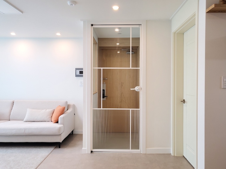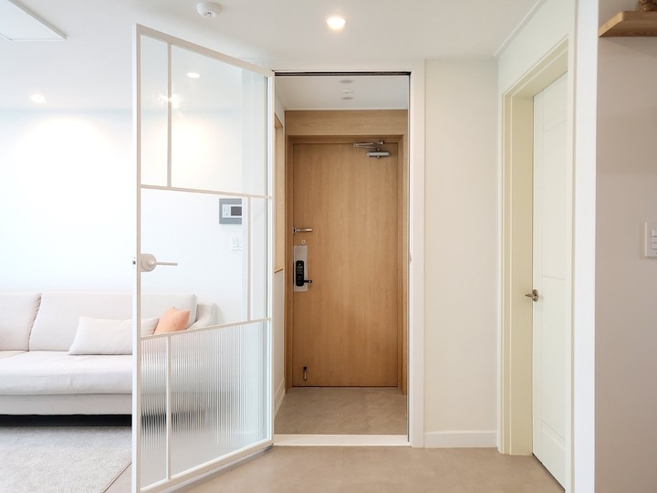 좁은 집은 슬라이딩 3연동 중문이 정석이라 생각했는데 리폼한 신발장 쪽으로 설치 공간이 나오지 않아 여닫이 중문으로 바꿔야 했어요. 여닫이 중문은 열고 닫는 방향을 정해야 하는데 오른쪽에 있는 방문과 닿지 않도록 오른쪽에서 왼쪽으로 열리게 했고 윗부분은 투명한 유리를 넣고 아랫부분은 신발을 가릴 수 있도록 모루 유리를 넣었어요.