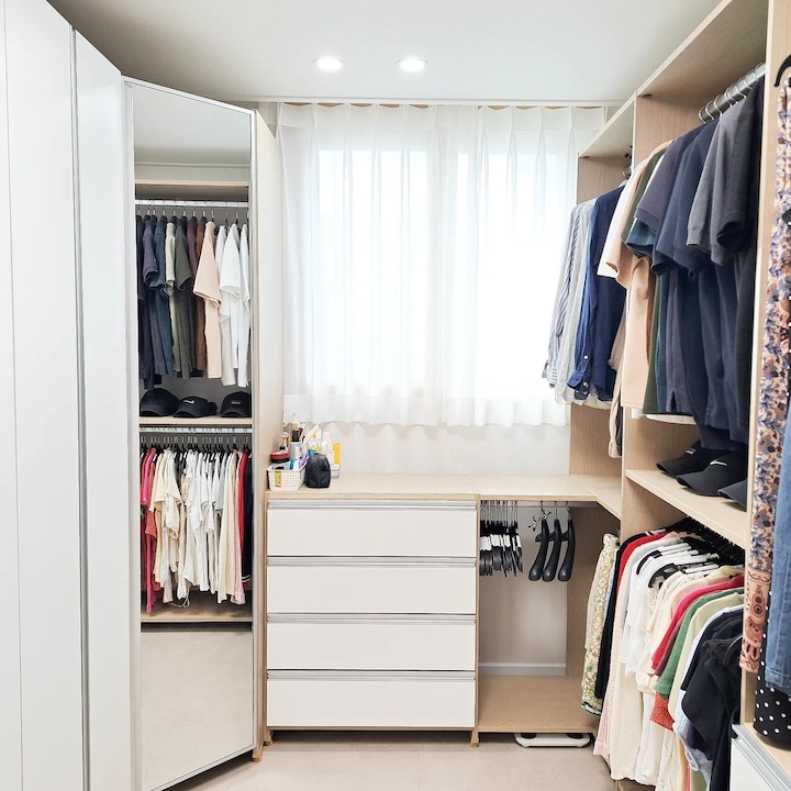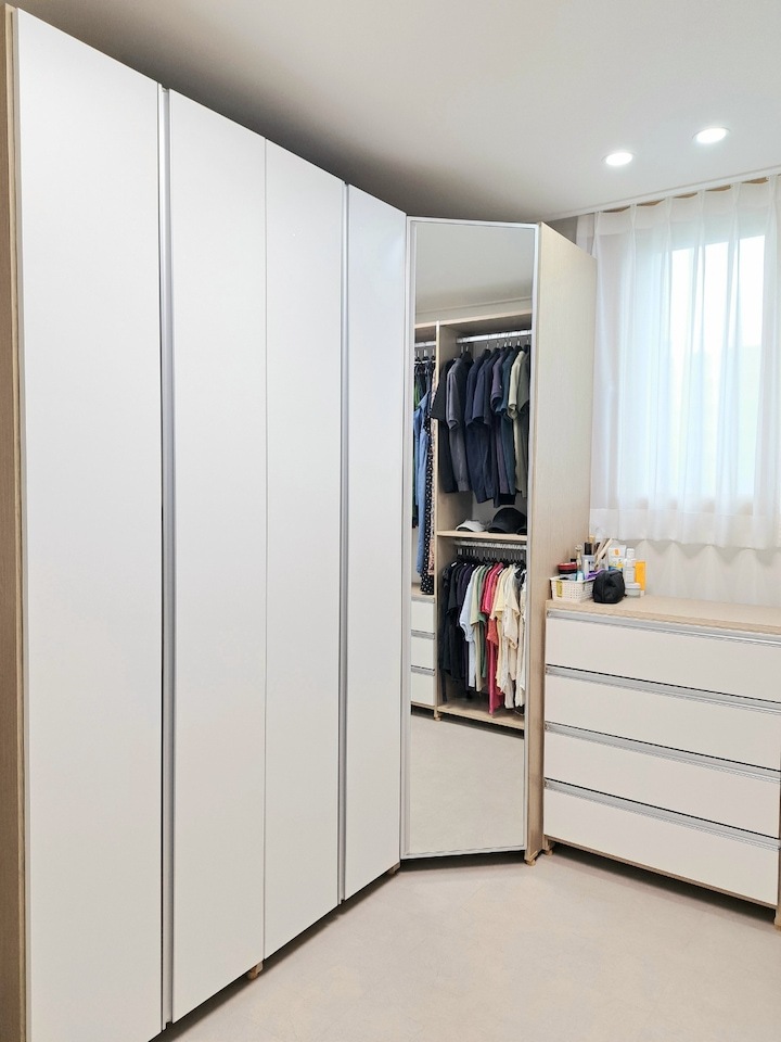 가운데 부분은 창문을 가리지 않도록 서랍장을 설치하고 바로 옆 코너장에 거울을 넣어 화장대를 겸해서 사용하고 있어요. 인테리어 시작 전에 시스템 행거를 어떻게 설치할지 정해두어 화장대로 쓸 수납장 위에 매립등을 설치했는데 밝고 선명하게 볼 수 있도록 전구색이 아닌 주광색의 매립등을 설치했어요.