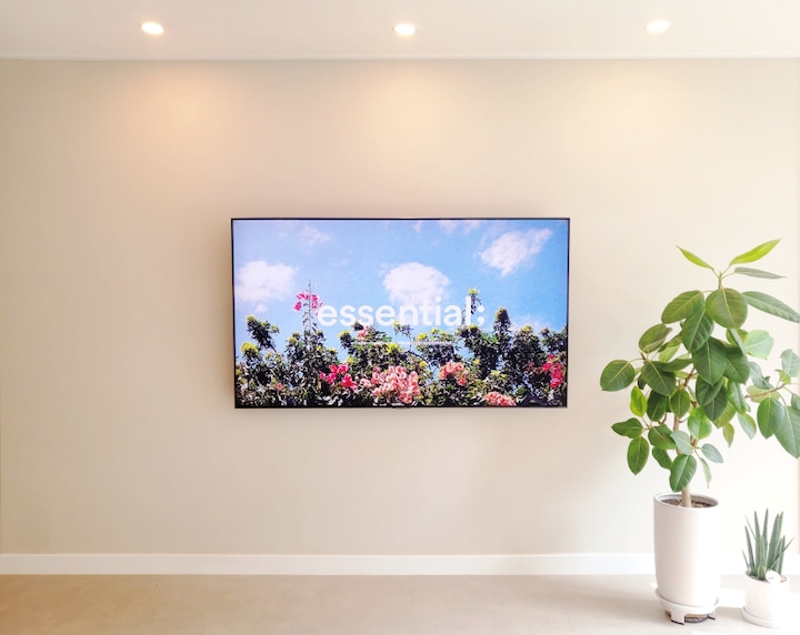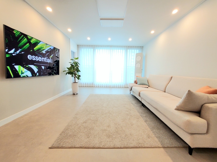 집에 들어오면 현관 다음으로 보이는 공간이 거실이기 때문에 심플하게 꾸며 넓어 보이도록 했어요. 가장 먼저 시선을 끊어내는 벽 몰딩을 제거하고 콘센트가 벽걸이 TV에 가려질 수 있도록 위쪽으로 옮겨 벽을 간결하게 정리했어요. TV는 매립하고 싶은 생각도 있었지만 1cm도 소중한 좁은 집이기 때문에 거실이 조금이라도 줄어드는 매립은 포기하고 거실폭을 감안해 65인치 TV를 벽걸이로 설치했어요.