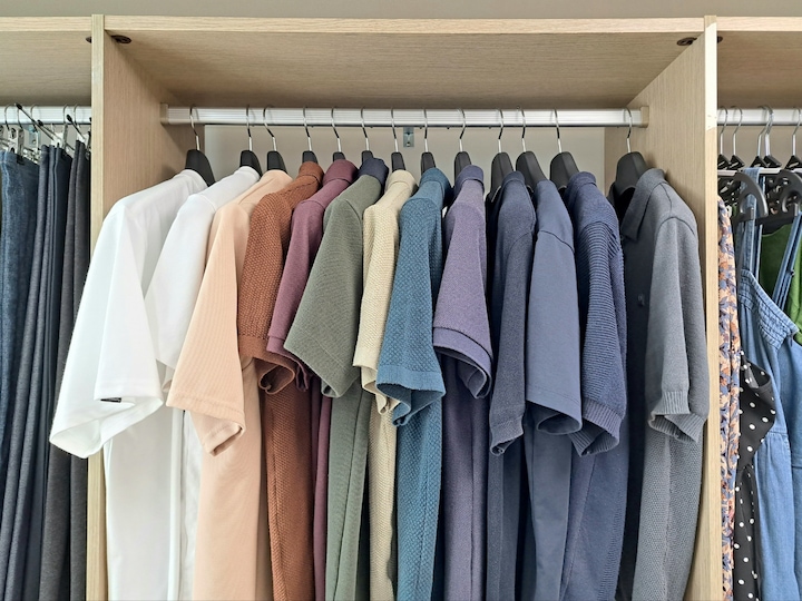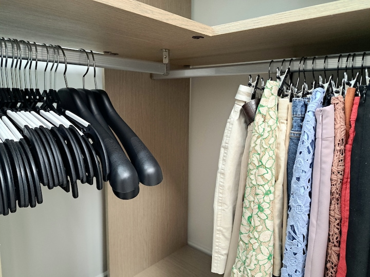 오픈장은 옷이 그대로 노출되어 지저분해 보이지 않을까 고민하시는 분들도 계실 텐데요. 깔끔하게 정리한 저희 집 팁은 옷걸이를 통일하고 옷을 색깔별로 모아 걸어두는 거예요.
