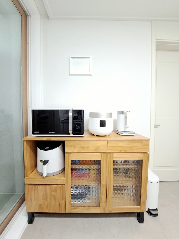 홈 카페로 꾸미려던 수납장은 화이트 컬러로 통일한 전자레인지, 밥솥, 전기 주전자, 에어 프라이기를 올려두고 수납장 안에는 라면이나 간식을 수납하는 용도로 사용하고 있어요.