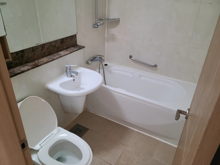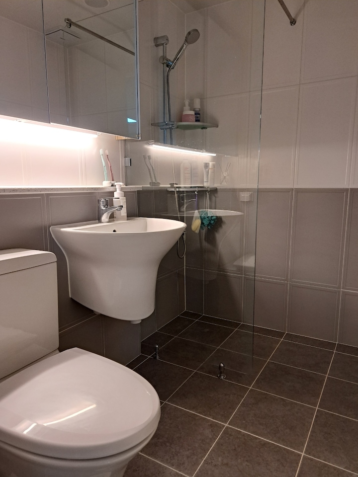 화장실이 2개인 24평 아파트라 그나마 큰 거실 욕실도 넓지 않아 욕조를 제거하고 투명 샤워 파티션을 설치해 답답해 보이지 않게 샤워 공간을 분리했어요.