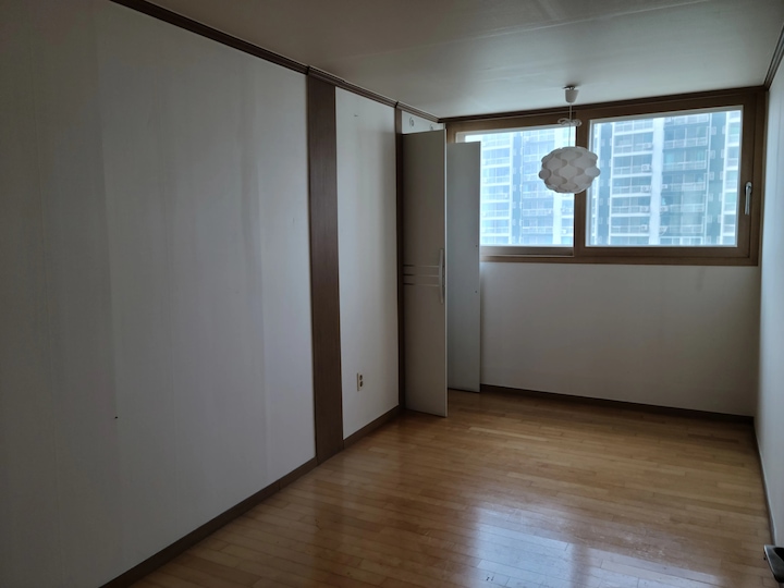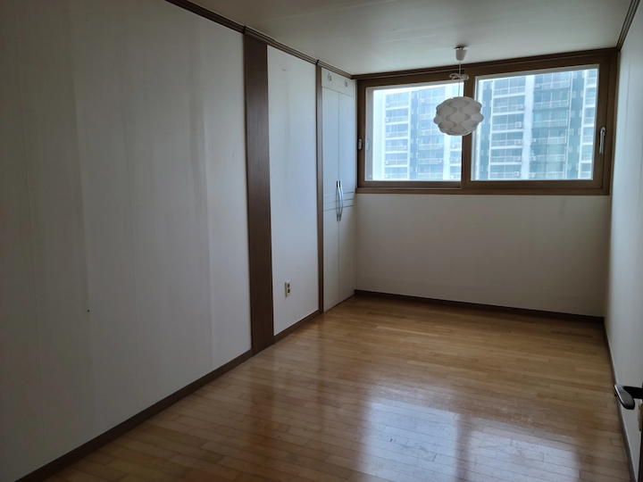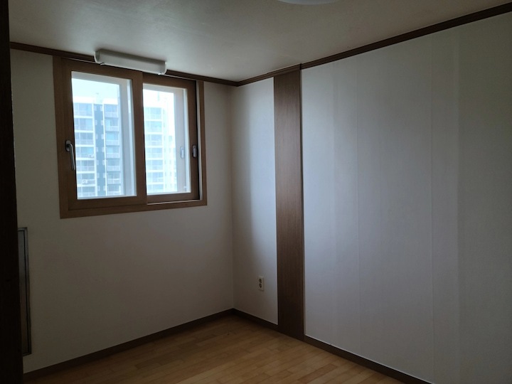 사진은 짐이 다 빠진 상태지만 처음 집을 보러 왔을 때 침대 헤드 쪽에 콘센트가 없어 멀티탭 선이 침대 양옆 바닥을 가로지르며 불편해 보이는 상태였어요.