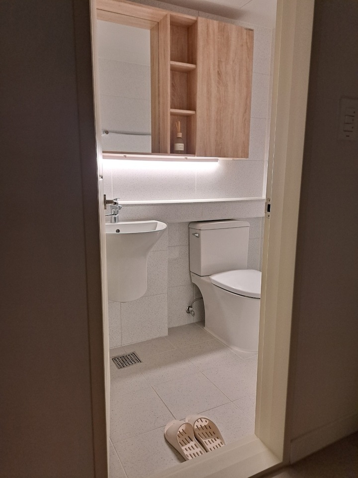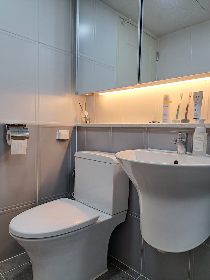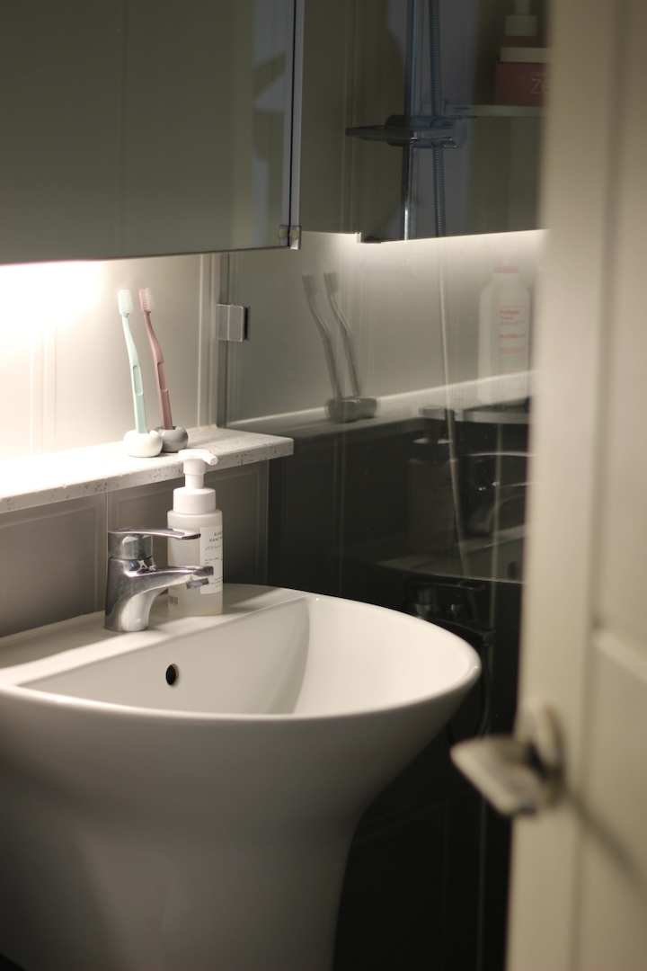 혹시 욕실 인테리어 사진마다 조명이 다른 것을 느끼셨나요? 욕실에도 주광색의 메인등과 전구색의 간접등을 스위치에 각각 연결해 작은 공간에도 변화를 줄 수 있도록 했어요.