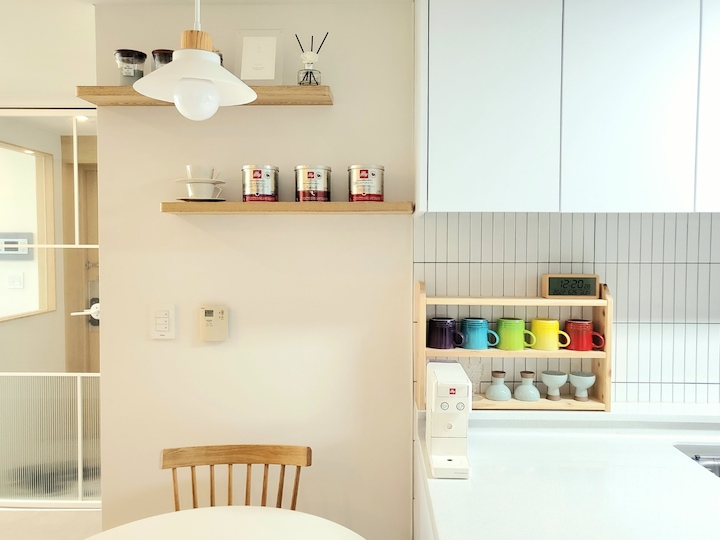 홈 카페 로망은 이루지 못했지만 아쉬운 대로 싱크대 일부 공간과 벽 선반을 활용해 커피 한 잔의 여유를 누리고 있어요.