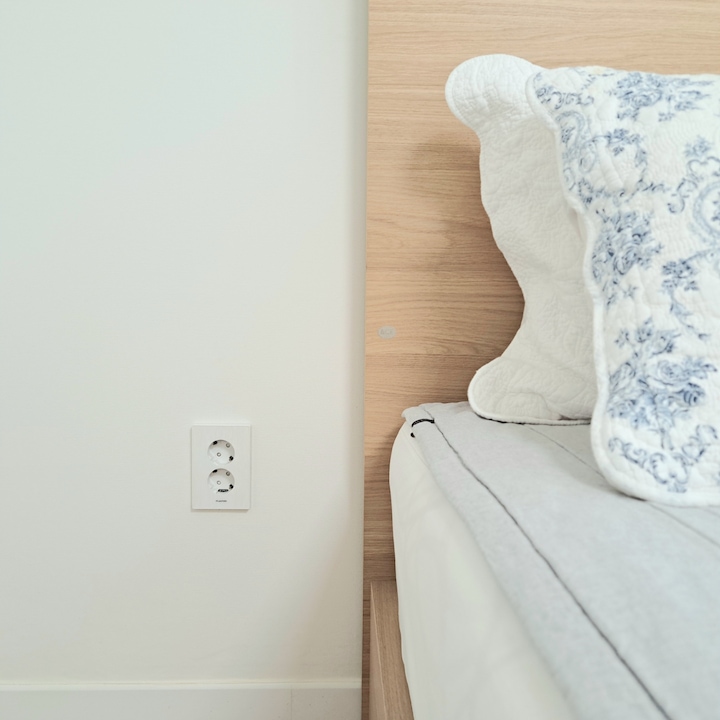 침대 헤드가 있는 벽은 보통 붙박이장이나 옷장을 놓는 위치라 콘센트가 없었지만 휴대폰 충전 등을 위해 콘센트 증설이 가능한 범위 내에서 추가해 주실 것을 요청드렸어요. 왼쪽 한 군데 추가할 수 있었는데 오른쪽도 전기를 사용할 수 있게 멀티탭을 침대 헤드 뒤쪽으로 연결한 뒤 협탁으로 깔끔하게 가려두었어요.