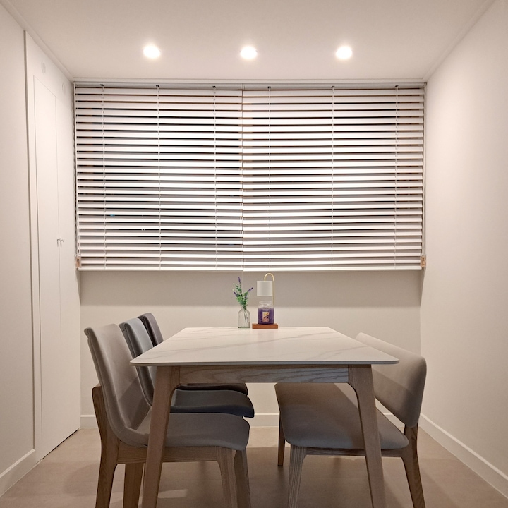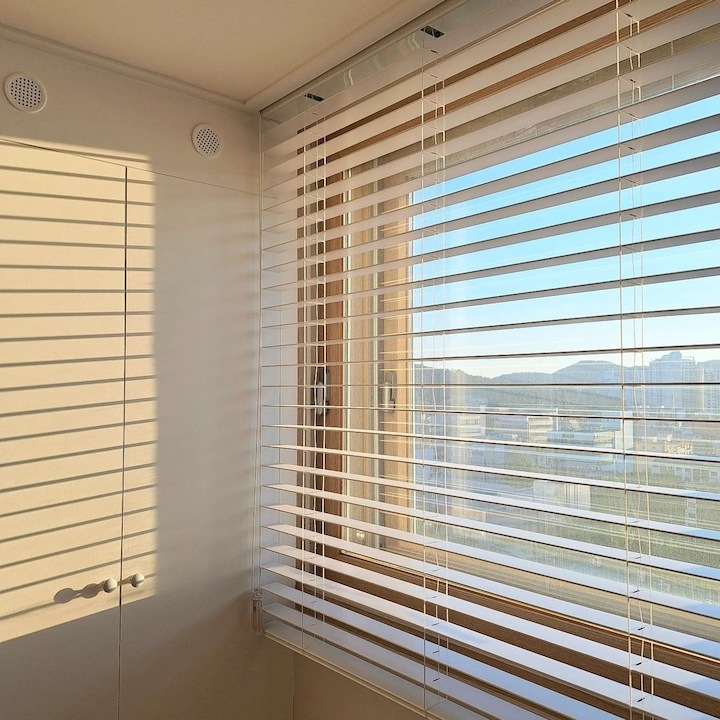 저희 집은 동향이라 서쪽 방향에 있는 서재 겸 다이닝룸은 오후가 되면 은은한 햇살이 들어오는데요. 쉬폰커튼을 달아둔 다른 공간과 다르게 블라인드를 설치해 그 사이로 들어오는 햇살이 더 포근하게 느껴져요.