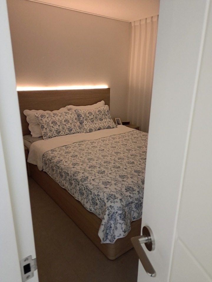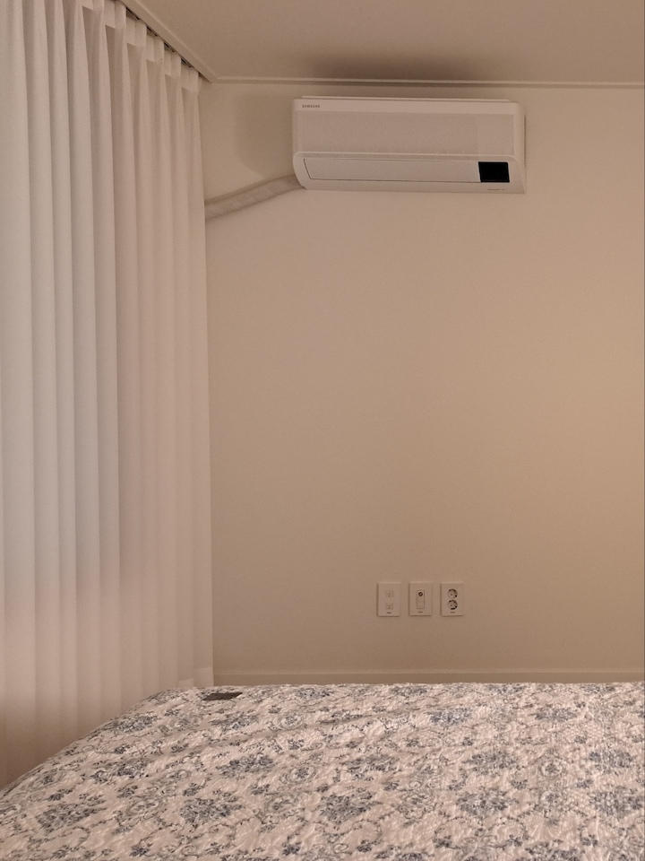 침실에 침대와 협탁, 벽걸이 에어컨뿐이라 침대에 누워 바라보면 썰렁하다고 느껴지기도 하지만 좁은 집이 넓어 보이게 하는 인테리어 취지를 살리고 또 언젠가 찾아올 저희 가족의 변화를 대비하기 위해 지금에 만족하고 있어요.