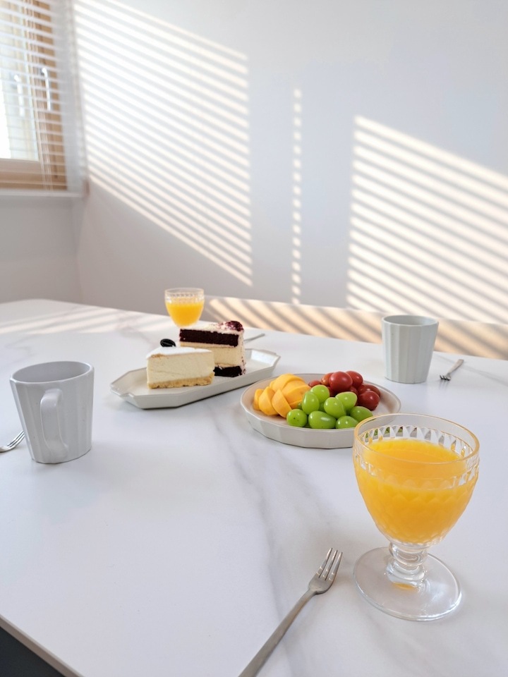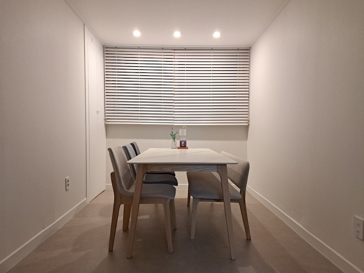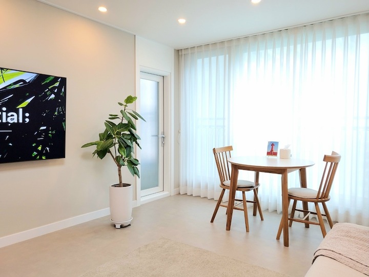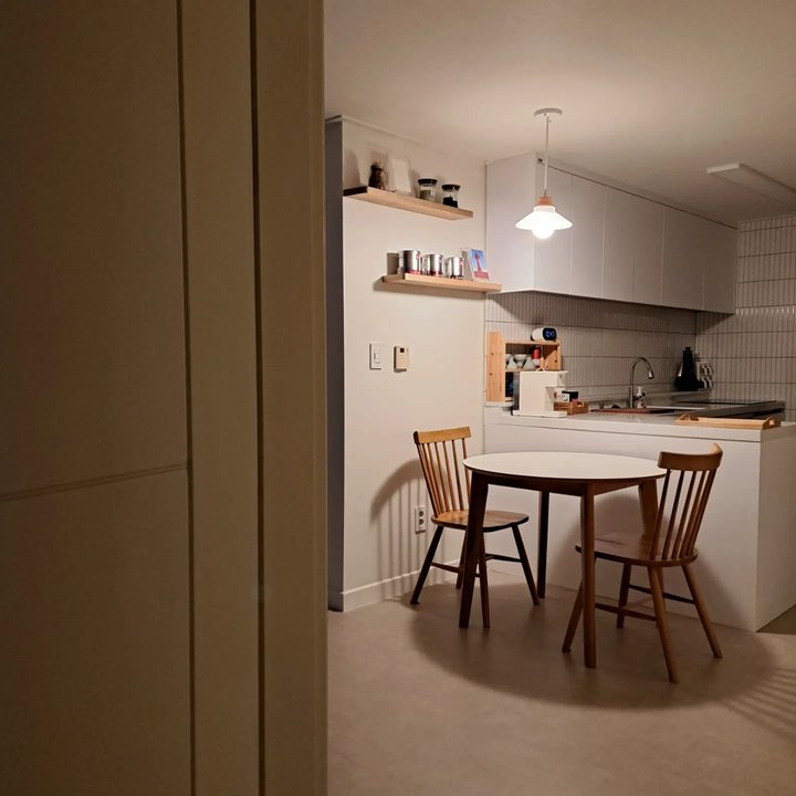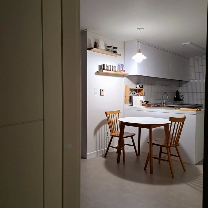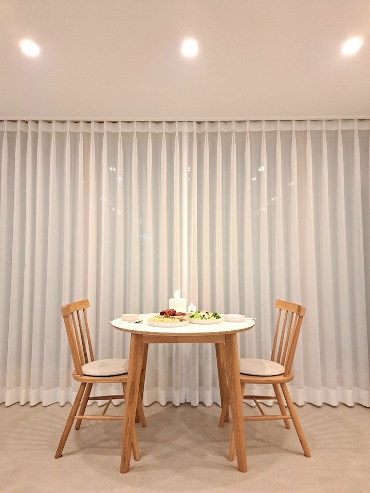 대신 미니멀한 공간이 주는 여유로움을 느끼고 거실의 빈 공간에 변화를 줄 수 있어 좋더라고요. 암 체어를 거실로 가져와 책을 볼 수 있고 쉬폰 커튼을 치고 거실 조명 아래로 주방에 있던 원형 식탁을 옮겨오면 주방과는 다른 식사 분위기를 연출할 수 있어요.