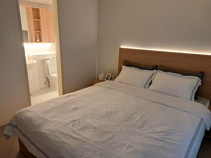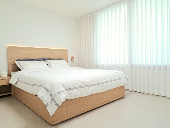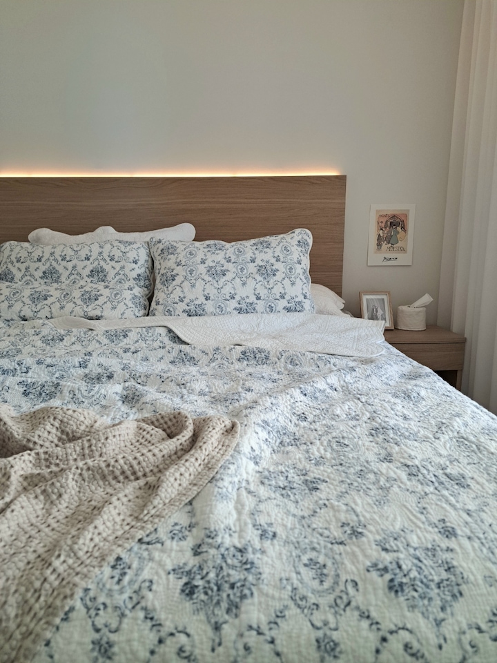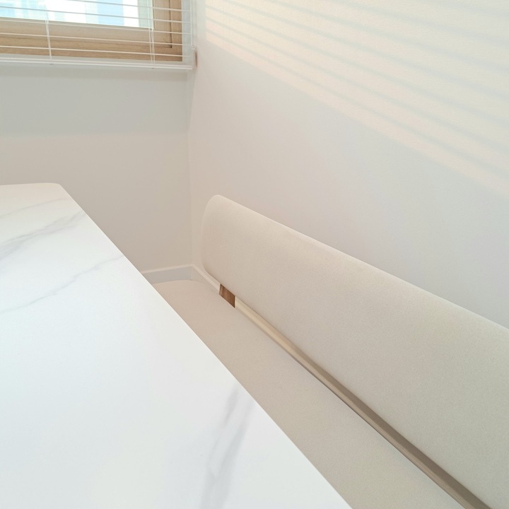 침실에도 거실처럼 전구색의 매립등을 침대 헤드 방향 위로 요청했는데 의사소통 오류로 누락되었어요. 잠시 아쉬운 마음이 들었지만 침대 헤드에 셀프로 붙일 수 있는 간접등을 찾아 조명 위치에 구애받지 않고 언제든 가구 배치를 바꿀 수 있어 오히려 만족하고 있어요.