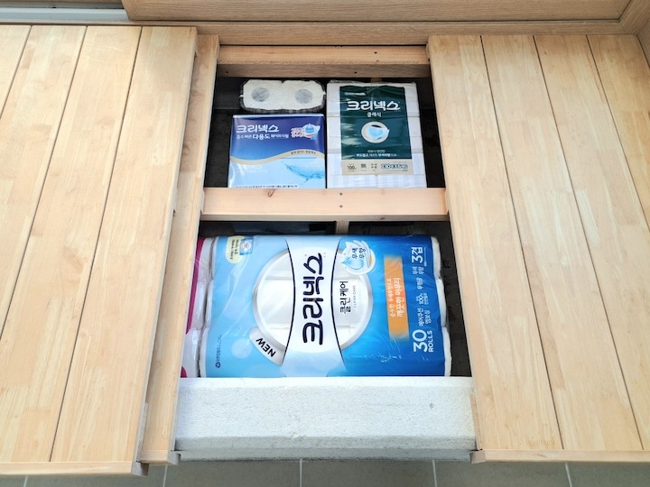 데크는 속이 비어 있는 덮개 형식이라 좁은 집에 소중한 수납공간을 제공해 휴지 등의 생활용품을 숨겨놓을 수 있어요.