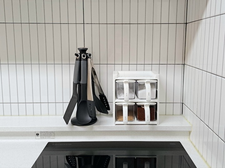 건조대를 설치하지 않아 조리 도구는 걸이대가 포함되어 있는 제품을 선택했고 양념통과 함께 인덕션 쪽에 두어 요리할 때 꺼내 쓰기 편리하게 했어요. 저희 집은 싱크볼 아래에 있는 보일러 분배기가 앞쪽으로 나와있어 부득이하게 선반을 설치해야 했는데 조리대나 인덕션과 분리가 되어 양념통과 조리 도구를 올려두고 쓰기 좋더라고요.