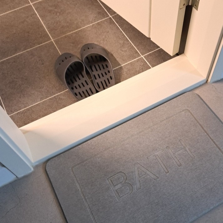 바닥 타일도 벽타일 하단 색상인 그레이로 맞추어 통일감을 주고 표면이 거친 타일을 선택해 미끄러움을 방지했어요.