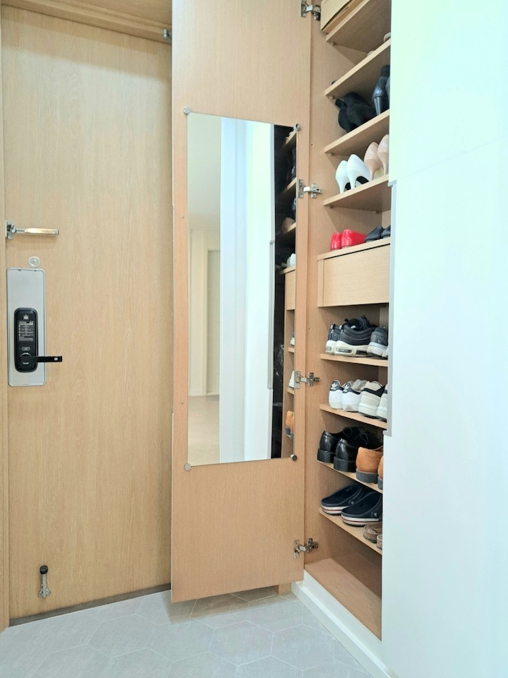 현관문은 우드색으로 필름을 붙였지만 신발장은 24평의 좁은 현관에서 넓은 면적을 차지하는 만큼 화이트 필름을 붙여 답답한 느낌을 덜어내고 안쪽으로 거울을 달아 리폼했어요.