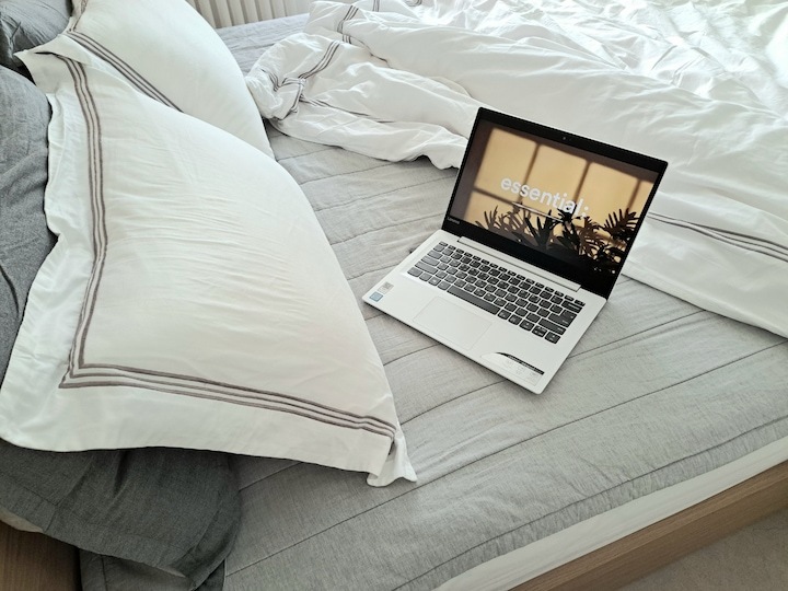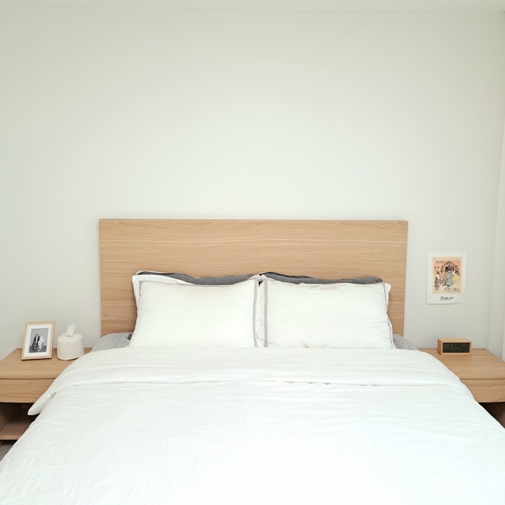 화이트 침구는 관리가 어렵지 않을까 싶어서 고민이 많았지만 화이트 외에 다른 건 눈에 들어오지 않았어요. 대신 누렇게 변색되기 쉬운 패드와 주로 사용하는 베개 커버는 그레이 컬러로 선택하고 이불과 데코용 베개 커버는 화이트에 그레이 포인트가 들어간 것을 구입했어요.