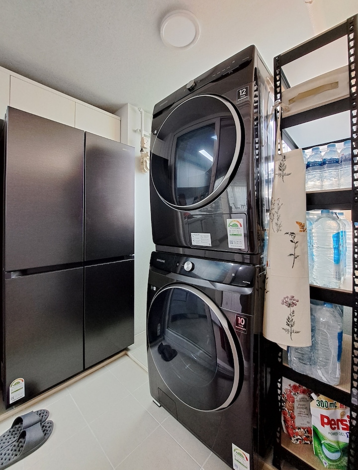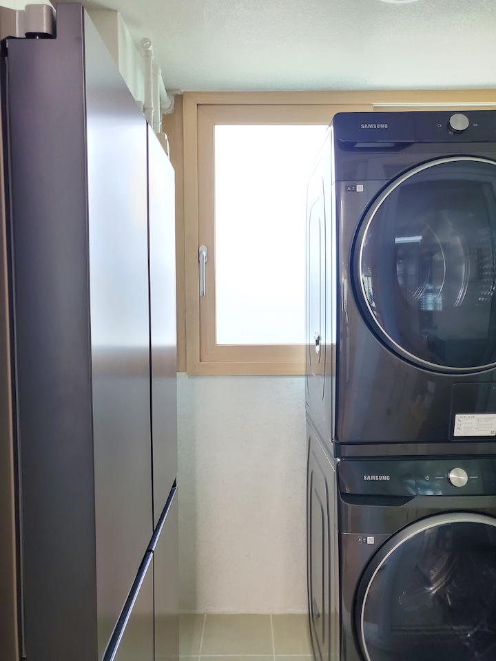컨셉은 화이트 우드지만 냉장고와 세탁기, 건조기는 블랙에 가까운 컬러로 선택했어요. 흰색 가전은 자외선을 받으면 누렇게 변색이 되는데 이 세 가전을 베란다에 두면 더 빠르게 변색될 것 같았거든요. 가전을 들이고 너무 튀면 레이스 커튼을 달아볼까 싶었는데 공간이 분리되어 크게 이질적인 느낌은 들지 않더라고요.