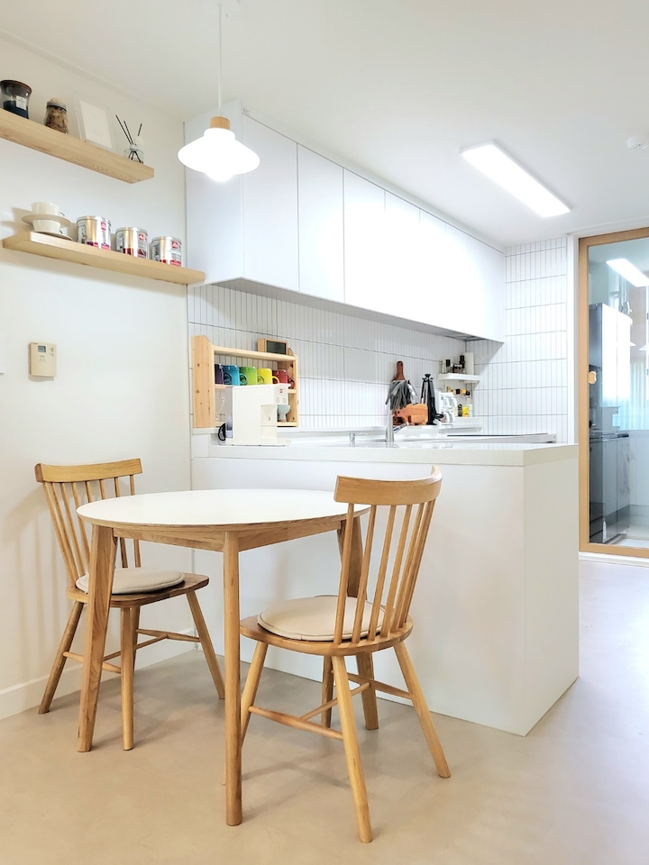 싱크대는 화이트로 했지만 식탁 공간에는 화이트와 우드 컬러가 조화로운 식탁과 의자를 선택했고, 벽 선반, 조명에도 우드가 포인트인 디자인을 선택했어요.