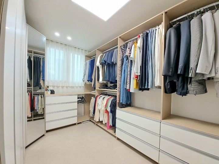 드레스룸은 시스템 행거를 설치할 예정이었기 때문에 기본적인 공사 외에 특별히 신경 쓴 것은 없었어요.