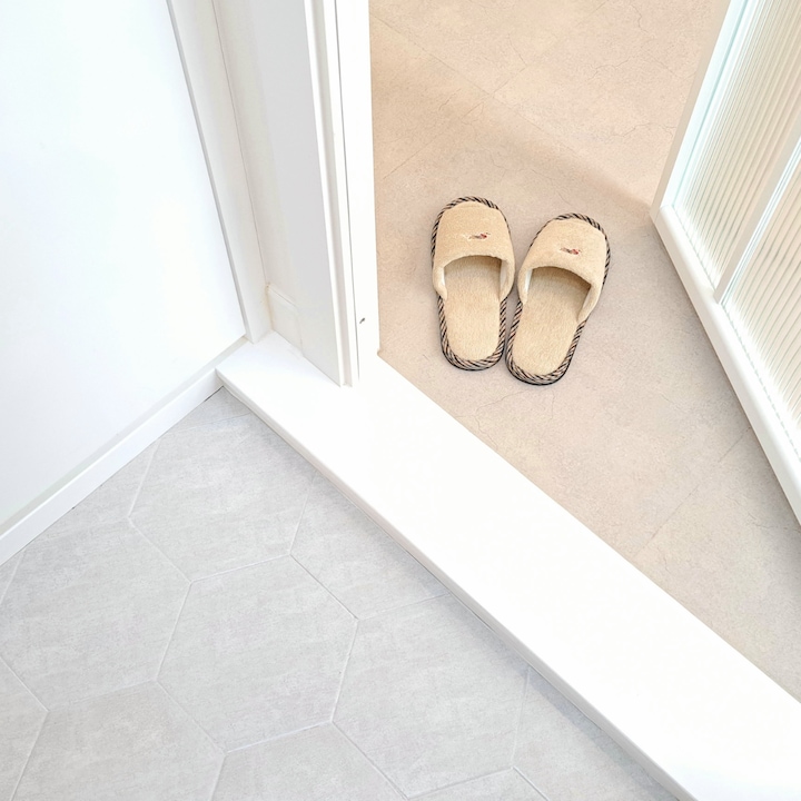 밝은 그레이 톤의 바닥 타일로 좁은 공간이 넓어 보이도록 했고 헥사곤 모양의 타일을 선택해 단조로움을 피했어요.