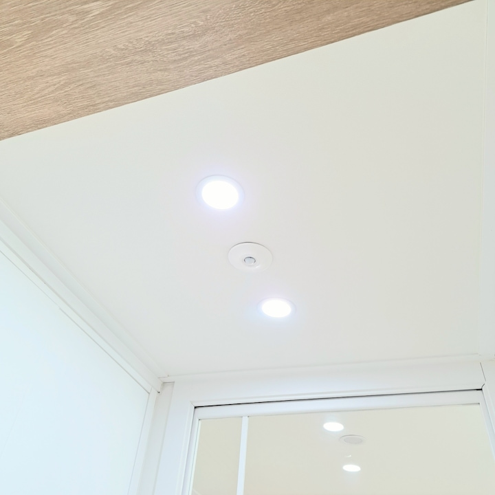 천정도 목공 공사로 매끈하게 처리하고 조명은 주광색의 엣지등을 메인으로, 거실 테두리 사면은 전구색의 매립등을 설치하고 엣지등 중앙, 엣지등 양 옆, TV-소파 벽면, 샷시 앞, 현관 앞 부분으로 나누어 5개의 스위치에 연결했어요.