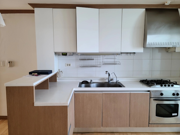 주방 베란다가 좁게 빠진 대신 작은 식탁도 놓을 수 있는 주방이었는데 싱크대 상판에 있는 가림벽이 답답한 느낌을 주었어요.