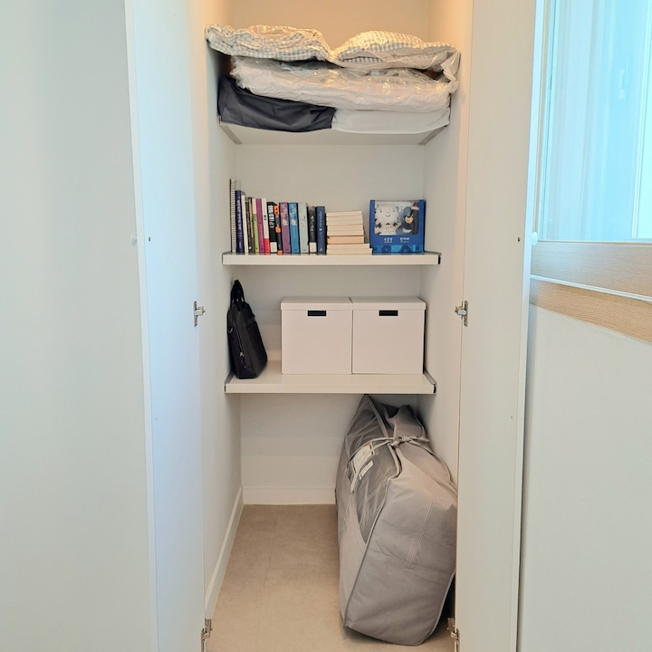 평수보다 넓은 집을 만들기 위해 미니멀 라이프를 추구하고 있어 필요한 책 외에 소장하지 않으므로 별도의 책장까지 둘 필요가 없었고 다이닝룸을 겸하고 있어 심플하게 꾸미고 싶었어요. 그래서 붙박이장도 책장 겸 이불장 2가지 기능으로 사용하고 있어요.