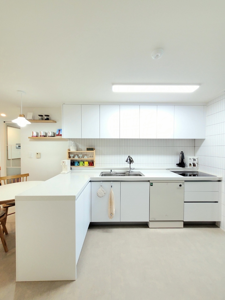 하부장에 식기세척기를 넣을 계획이었기 때문에 수납공간을 확보함과 동시에 식탁과 싱크대 공간을 분리하기 위해 ㄱ자로 싱크대를 설치했어요. 그런데 좁은 평수의 집이라 ㄱ자 부분의 길이를 얼마나 뽑을지도 중요하더라고요. 저는 사람 동선만 생각하고 최대한 길게 뽑고 싶었는데 인테리어 담당자분의 조언이 없었다면 냉장고가 지나가지 못하는 사태가 발생할 뻔했어요.