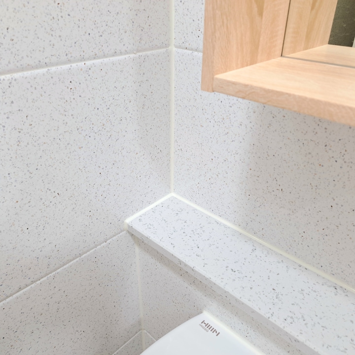 새하얀 타일은 화장실 관리에 어려움이 있을 것 같아 입자가 작은 테라조 타일을 사용했고 젠다이 대리석과 바닥 타일까지 통일감을 주어 더 넓어 보이는 공간으로 연출했어요.
