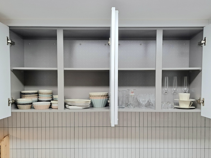 베란다에 이어 주방에도 건조대를 설치하지 않았는데요. 식기세척기를 사용하기 때문에 상부장에 달아두는 건조대는 필요하지 않았고 식기세척기에서 세척, 건조된 그릇은 다음 작동을 위해 싱크대 상부장에 넣어 정리하고 있어요.