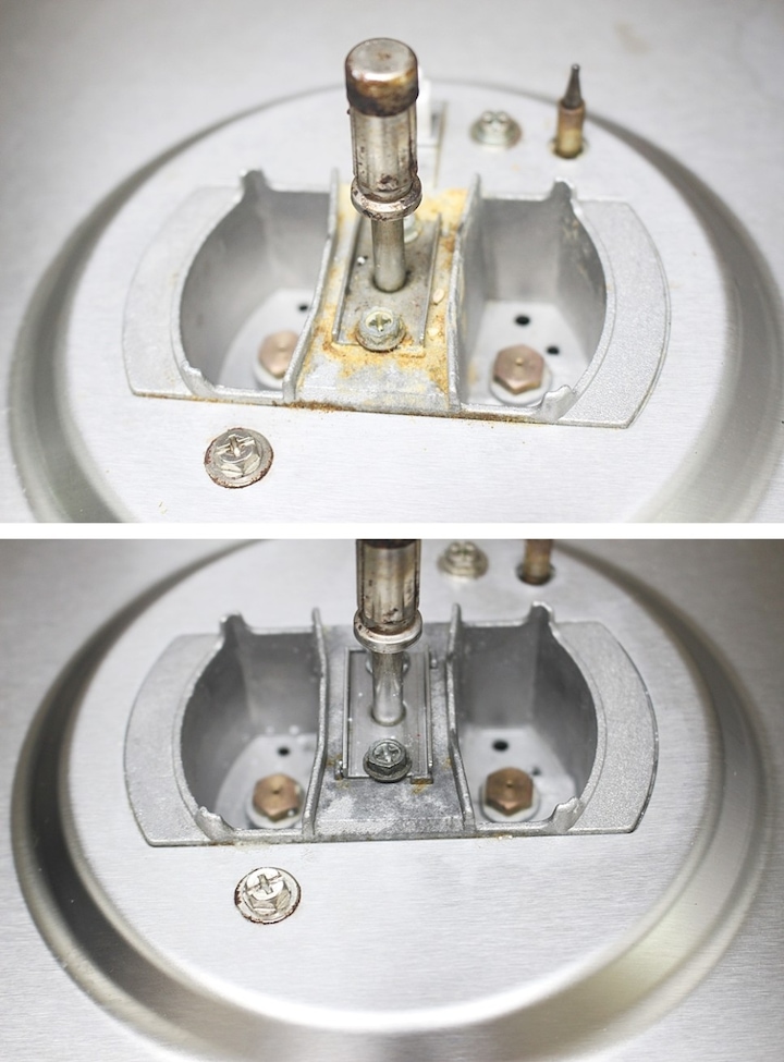 버너헤드까지 모두 분리한 가스레인지의 본체 부분 모습. 국물요리 할 때 넘치고 넘쳤던 증거들이 이렇게 모두 여기 눌러 붙어 있어요.