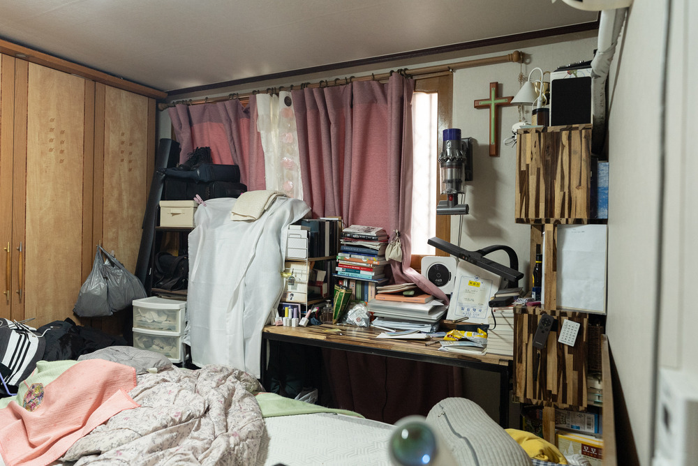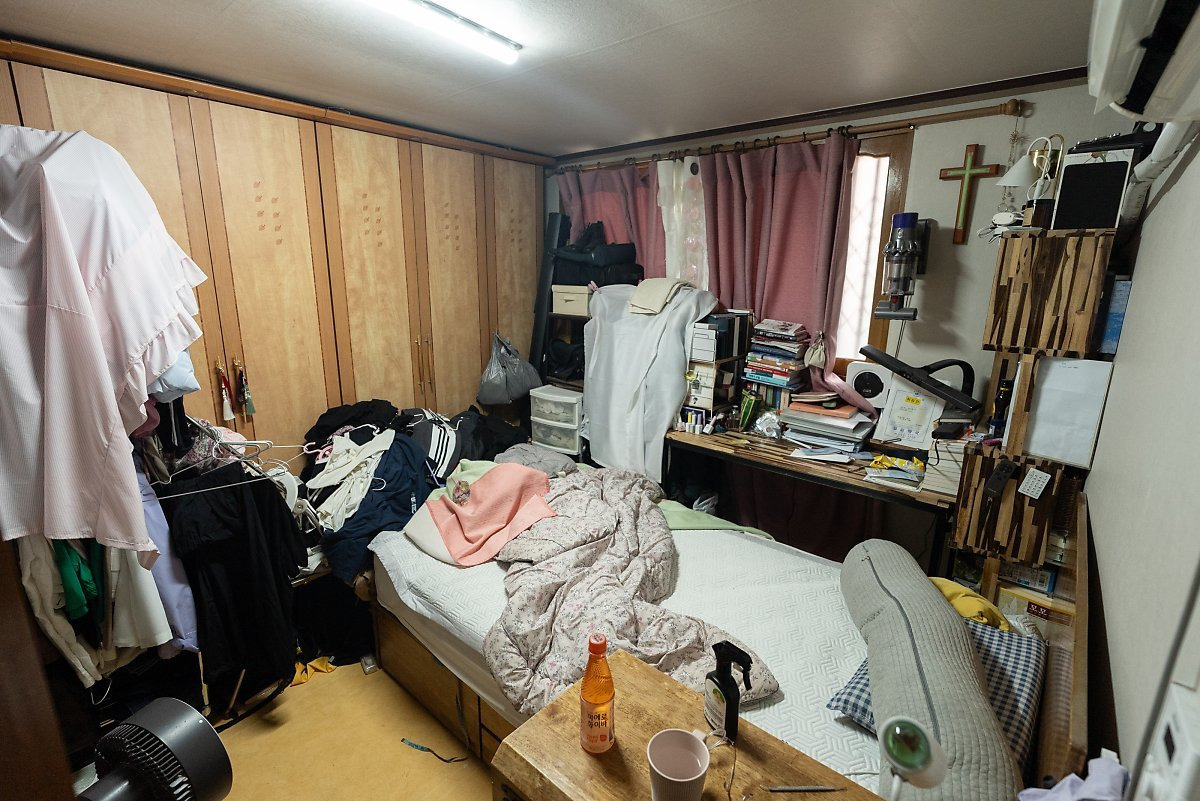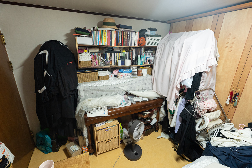 그리고 여기저기에 옷들이 정말 많았는데요. 부모님 옷도 같이 보관 중이라고 하셨는데, 워낙 많다 보니 사용하시던 행거도 무너져있더라고요. 행거가 붙박이장을 막고 있어서 문을 열기도 어려워 보였습니다.