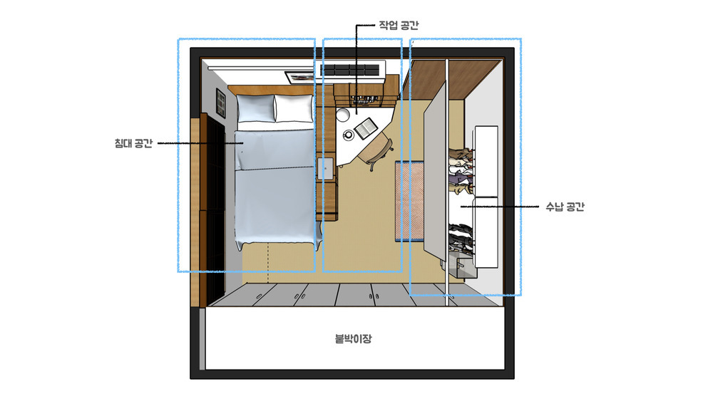 부피가 큰 침대는 가장 안쪽으로 배치해 주고, 그 옆으로 책장을 ㄱ자로 배치해 주었는데요. 책장 앞으로는 코너형 책상을 두어 공간 활용도를 높여 주었어요. 그리고 오른쪽 벽으로는 서랍장, 벽행거, 벽선반을 설치해 수납공간으로 구성해 주었습니다.