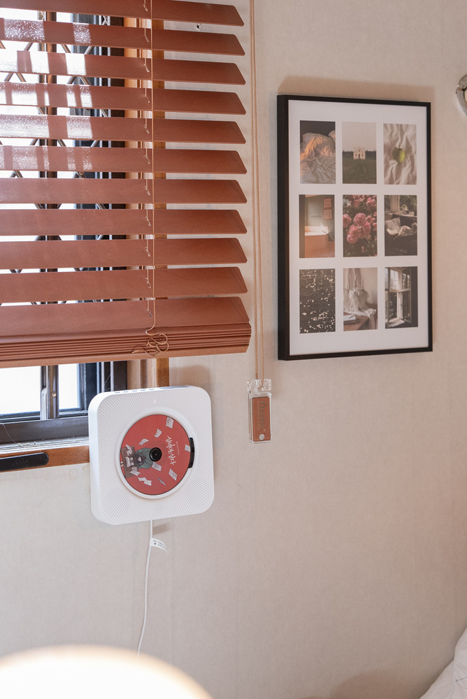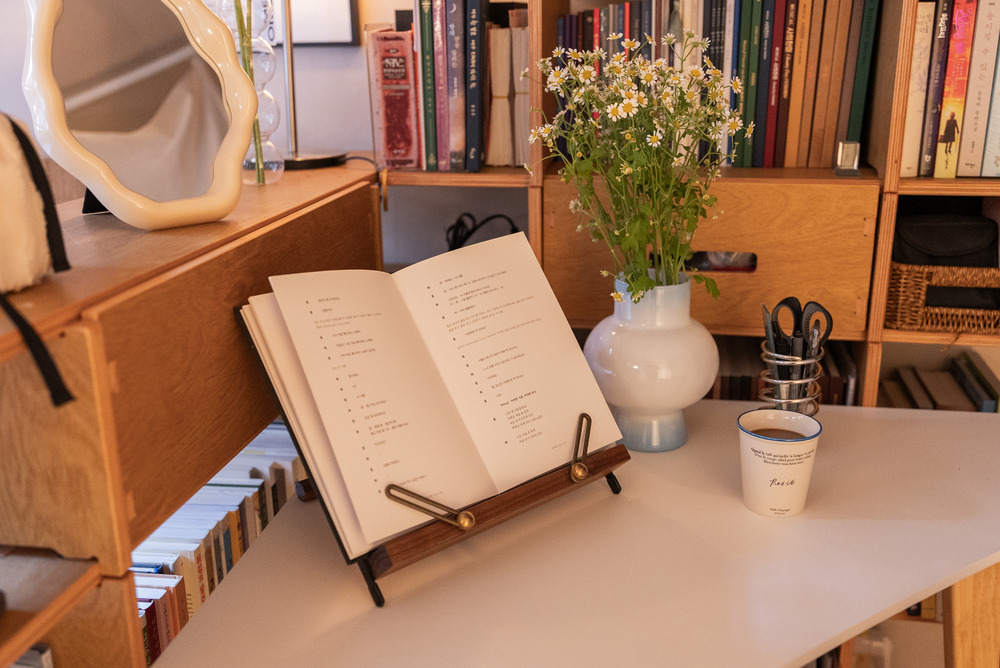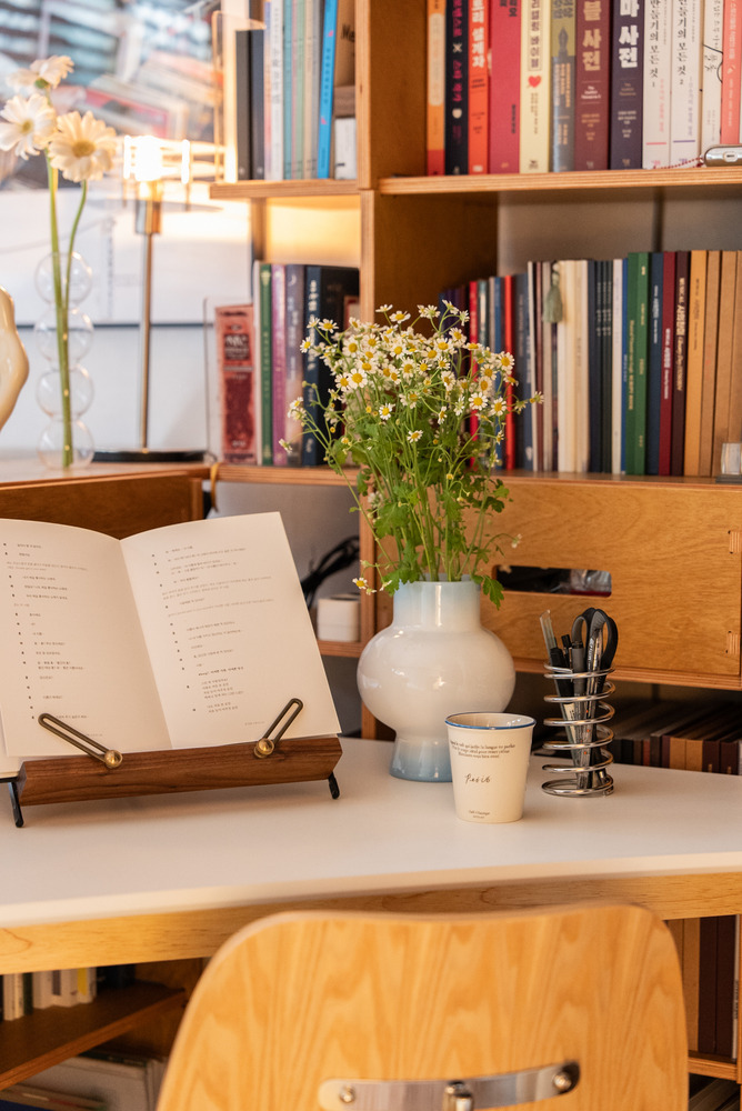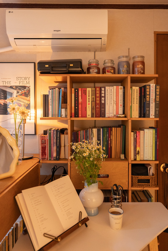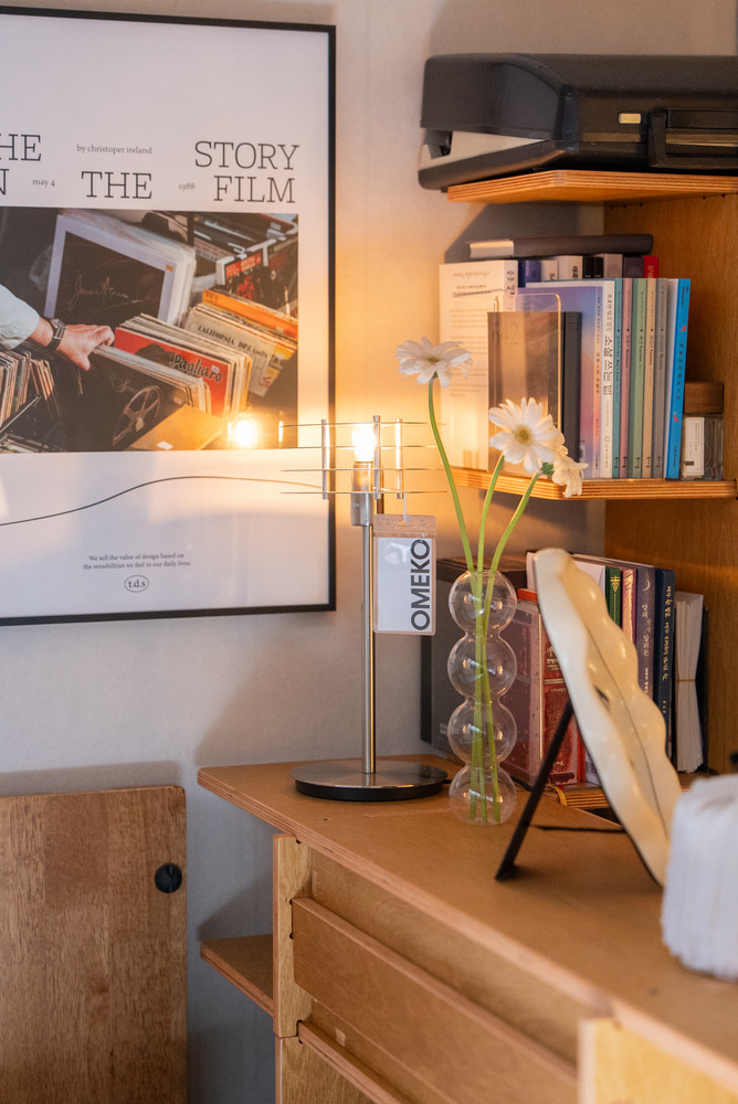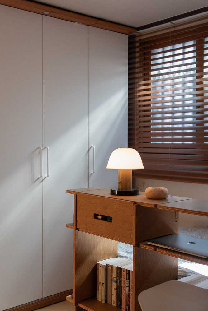 책장 위에는 버섯 모양의 무선 조명도 하나 두어 여기저기 위치를 옮겨가며 사용하실 수 있도록 했어요.