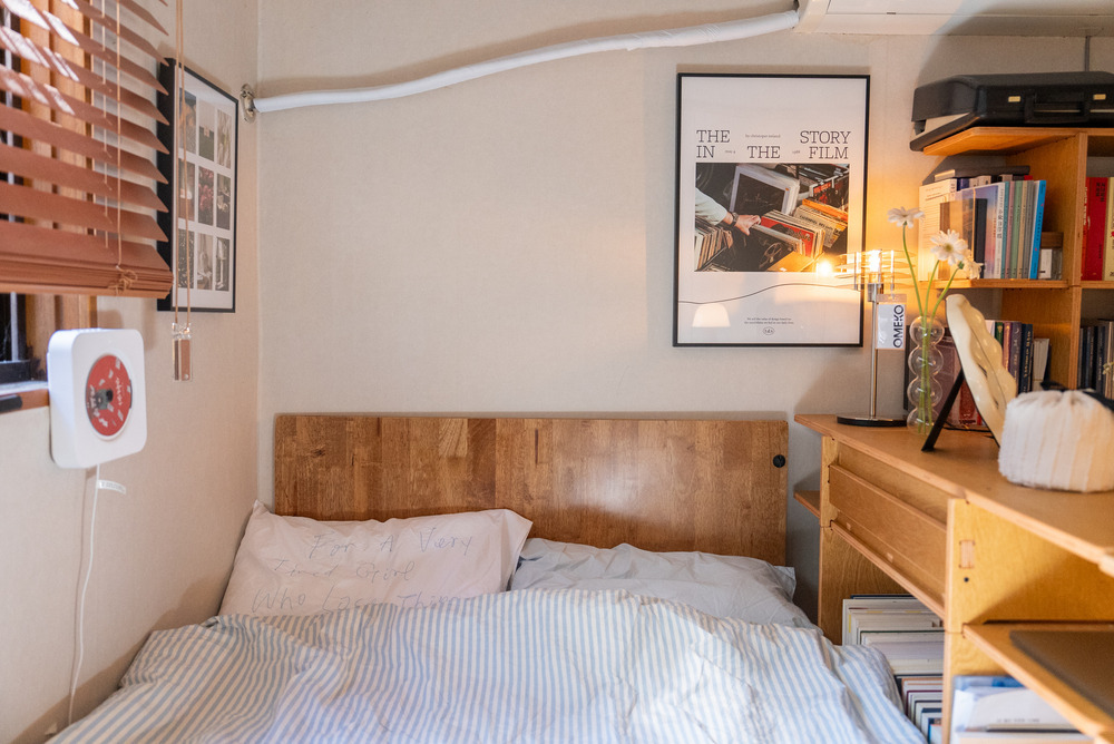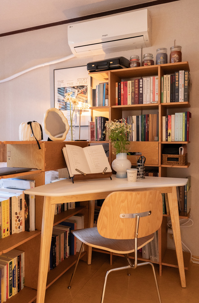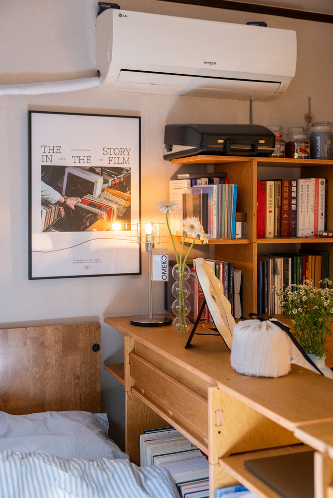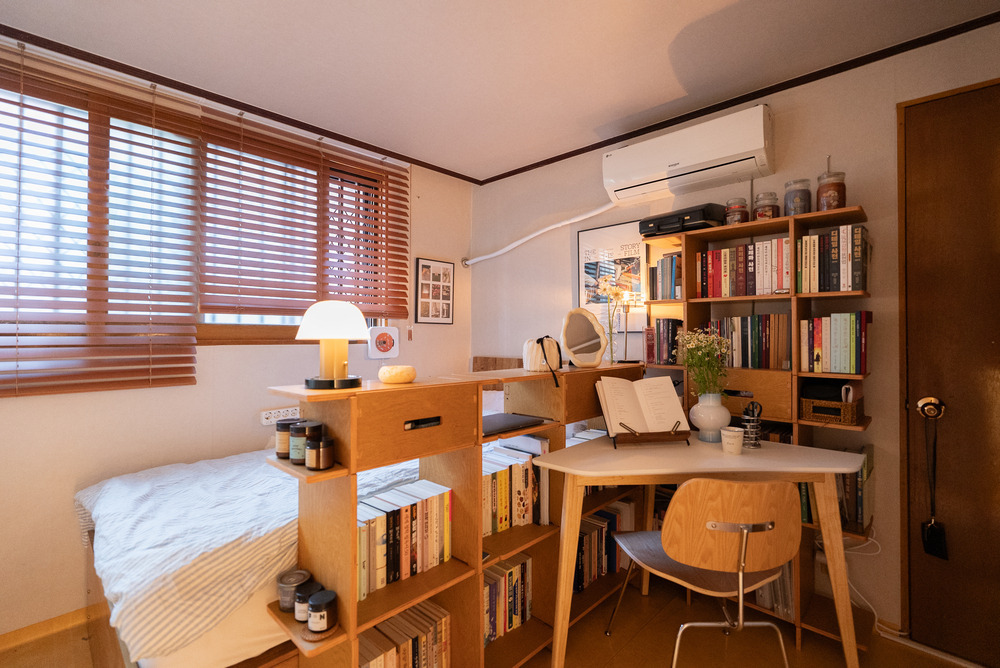 침대 안쪽, 창문 앞으로는 책상이 있었는데요. 평소에 여기서 독서 등 간단한 작업들을 한다고 하셨는데, 의자를 둘 공간이 마땅치 않아 침대에 앉아서 사용하다 보니 불편함을 느끼셨다고 해요. 그리고 책을 읽는 걸 좋아하셔서 책이 워낙 많다 보니 한곳에 정리해둘 수 있는 수납장이 필요해 보였습니다.