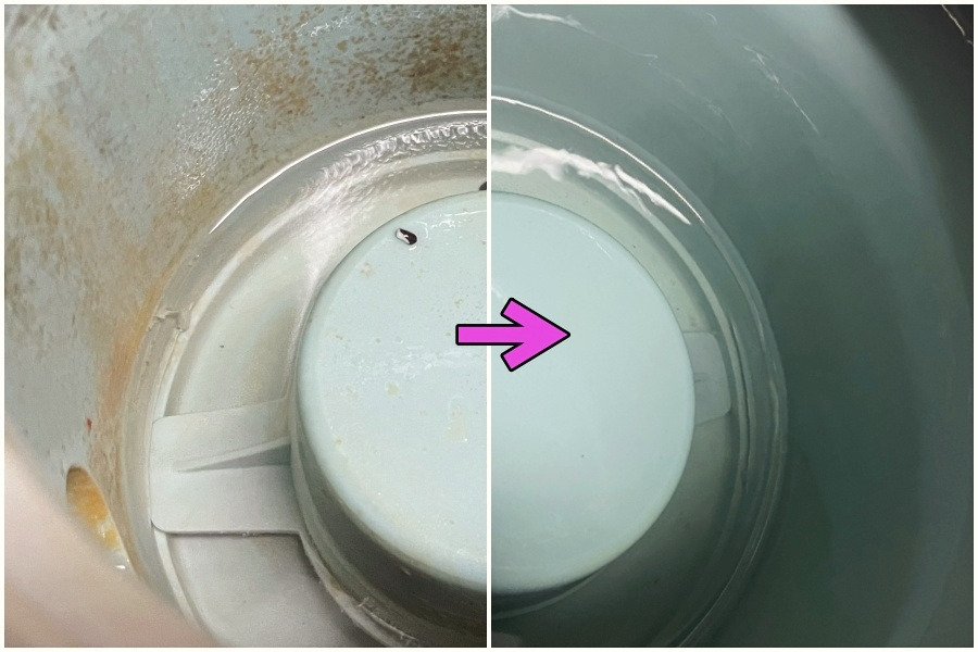 그러면 거품이 뽀글뽀글 올라오면서 청소가 자동으로 되는데요. 이때 가스가 발생하니 꼭 환기하세요! 잠시 이대로 두셨다가 물을 뿌려주시면 끝!