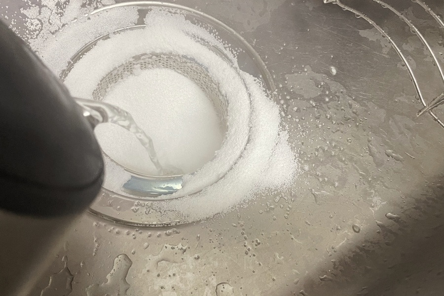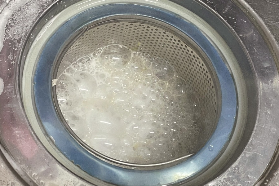 먼저 할 일은 배수구에 물이 빠져나가지 않도록 배수구 구멍에 비닐봉지를 넣어 막아주세요. 그다음 과탄산소다를 넉넉히 뿌려줍니다.