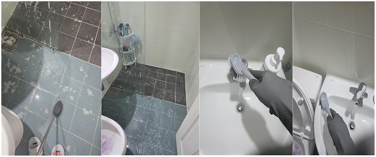 4) 이제 바닥 청소와 세면대 청소입니다. 바닥 솔로 불린 세정제를 팍팍 쓸어주고 문질러 바닥청소를 해줍니다. 세면대 청소는 틈새솔 브러쉬로 세정제를 문질러 닦아줍니다.