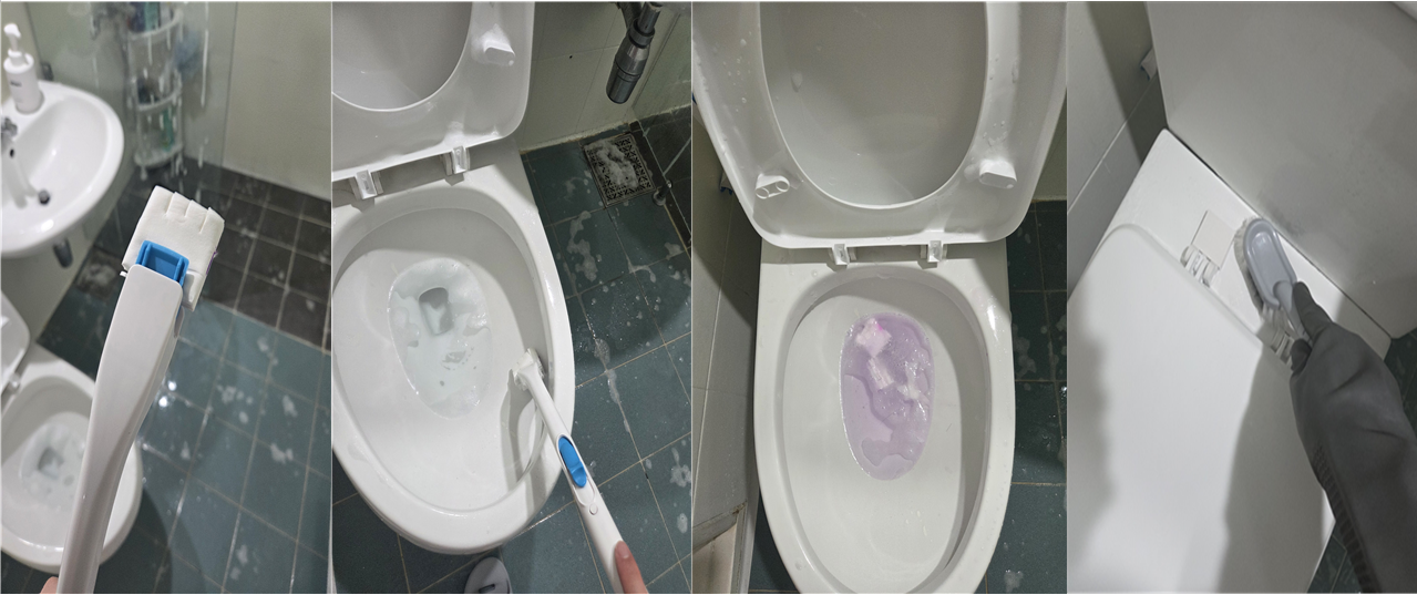 3) 다이소 변기클리너 리필용을 다이소 변기클리너 본체에 장착하여 변기 내부와 외부를 골고루 비벼 닦아줍니다. 변기클리너가 길기 때문에 깊은 곳까지 깊숙히 청소가 가능하며 거품이 생기면서 세균과 얼룩이 사라집니다. 외부는 틈새솔 브러쉬로 닦아줍니다.