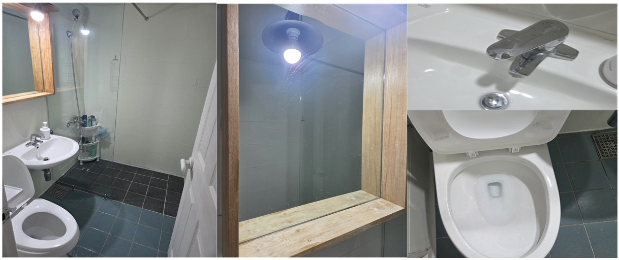 1) 화장실 청소 전 사진입니다. 거울, 유리, 세면대에 물때와 오염자국이 있고, 바닥도 곰팡이 까지는 아니지만 더럽고, 변기에 털과 얼룩이 있습니다. 변기청소, 거울, 세면대, 유리 청소, 바닥 청소 순으로 진행하겠습니다.