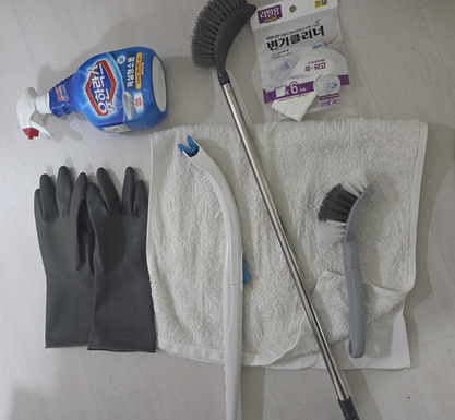 - 다이소 변기클리너 본체(3000원, 품명 : 1030899), 다이소 변기클리너(리필용)(6개 1,000원), 유한락스 욕실청소용 세정제, 고무장갑 1세트, 걸레(수건) 1개, 청소솔(바닥 솔, 틈새솔) 1개씩